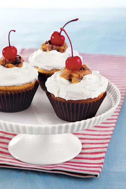 Mix coconut-pecan frosting and raisins in a medium bowl. Spread white frosting evenly over cupcakes. Make slight indentation in frosting in center of each cupcake; spoon about 1 tsp. coconut-pecan frosting mixture in each indentation. Top each with a cherry.